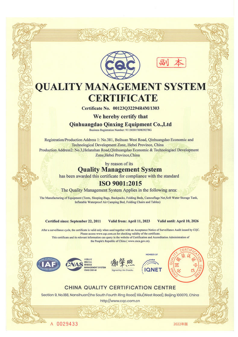 秦皇島秦興裝具有限公司有限公司源于我國第3524工廠,創(chuàng)建于2005年,占地面積30畝,是一家致力于研究,發(fā)展,制造和銷售為一體的綜合性裝具及紡織服裝加工生產企業(yè),我們的主要產品有單、棉帳篷,民用帳篷,旅游帳篷集各種機工產品等。